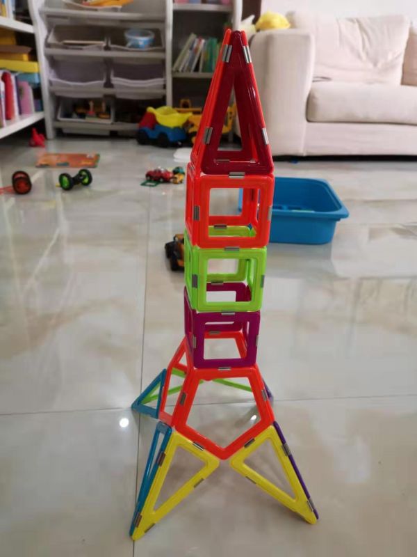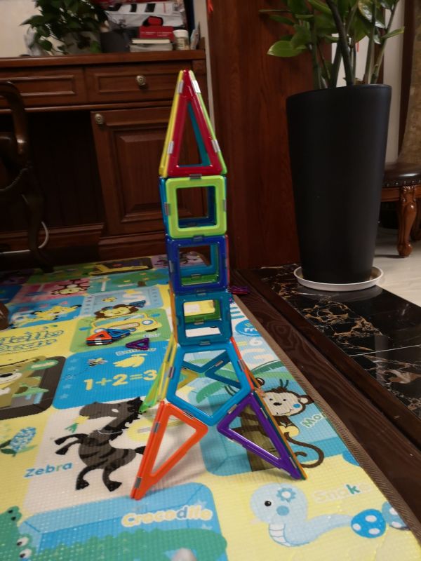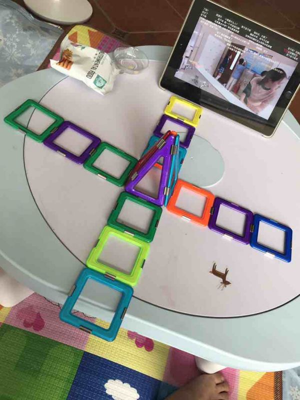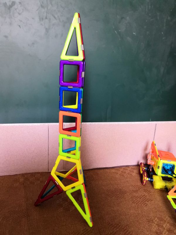 玩转磁力片,在妈妈的指导下妞妞摆好磁力片,一边说,让宝宝来,让宝宝来,一把提拉完成,看,大火箭。嗯,有进步了。