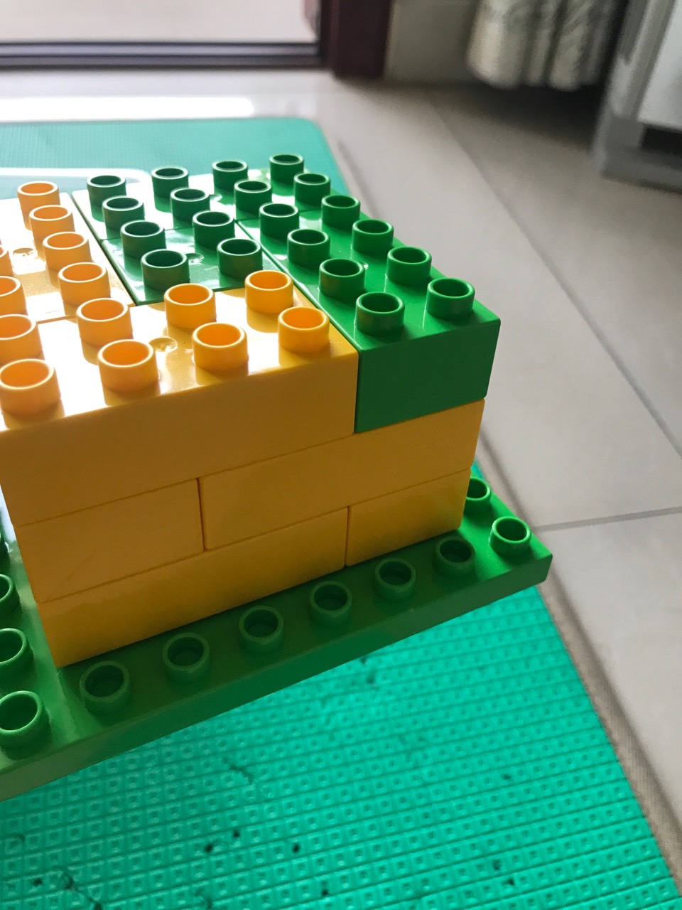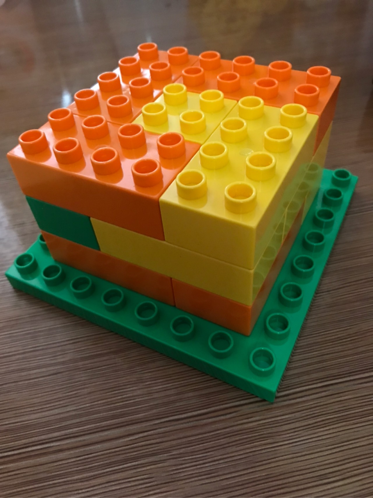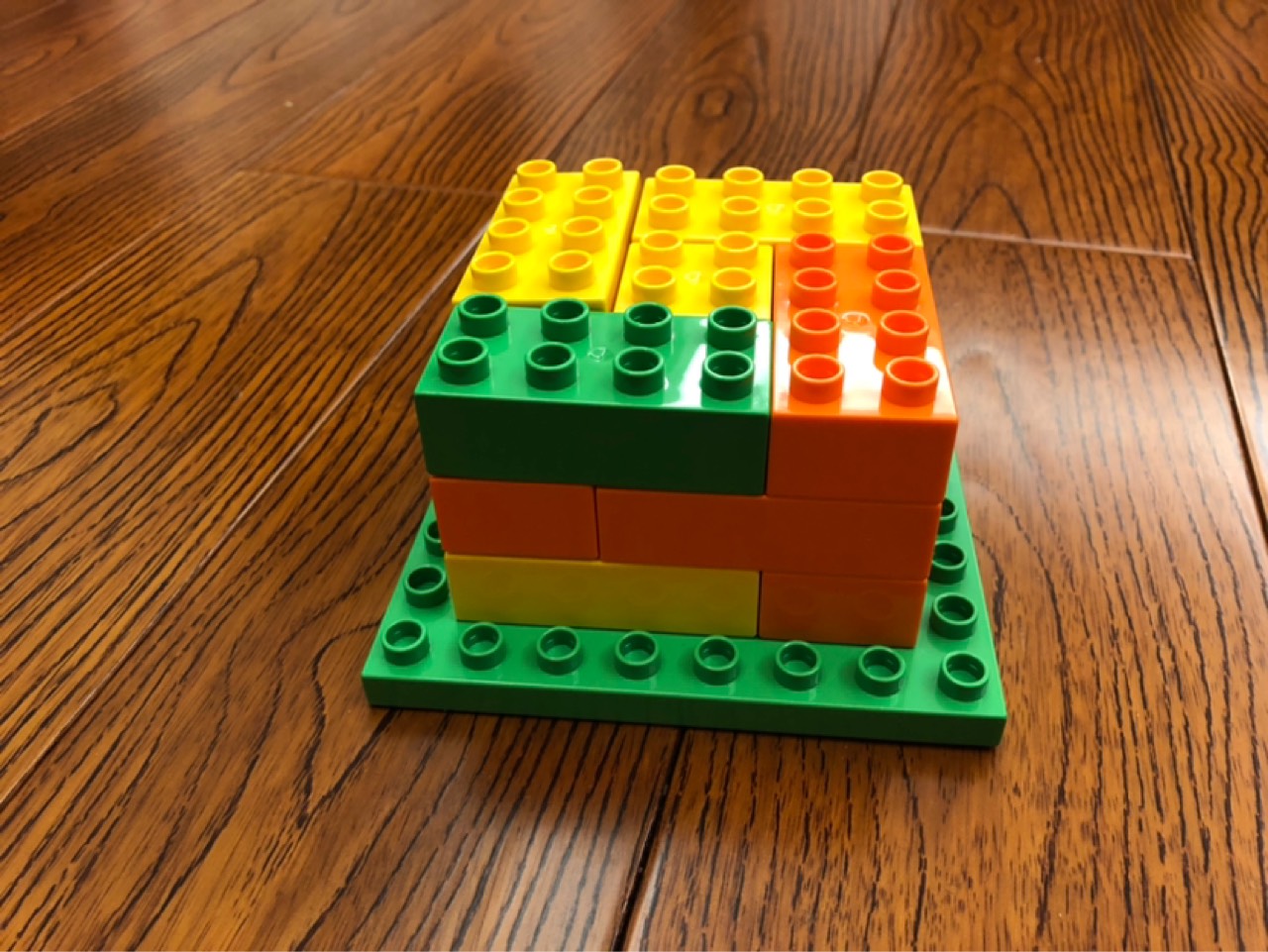 使用长方形方砖一圈一圈的互锁围起来,中间用正方形方砖填充起来,形成一个实心的正方体。