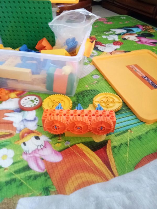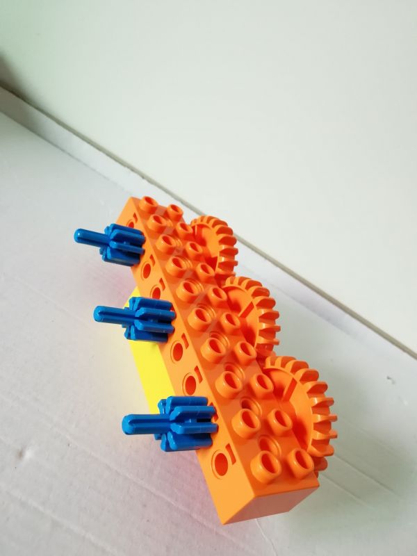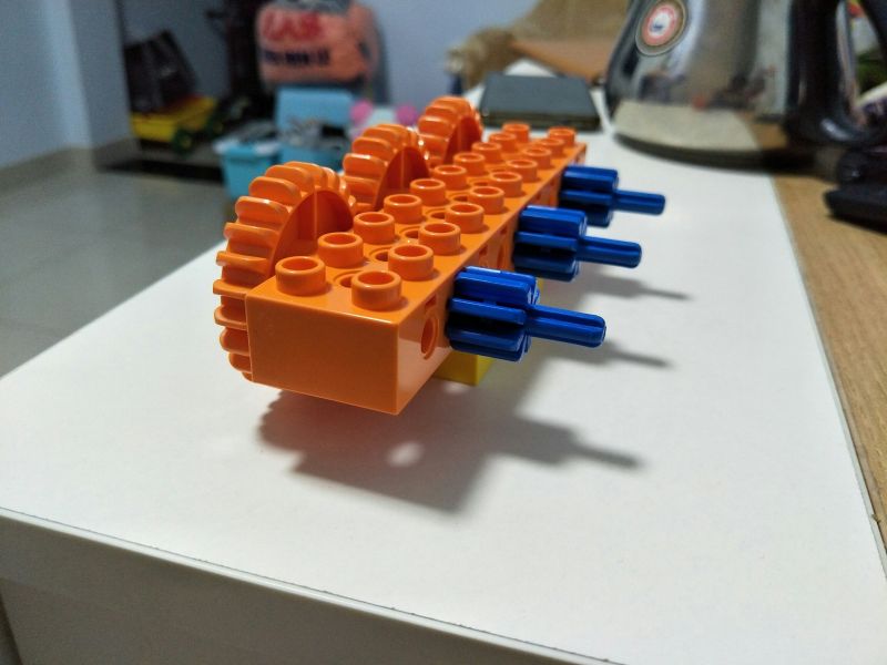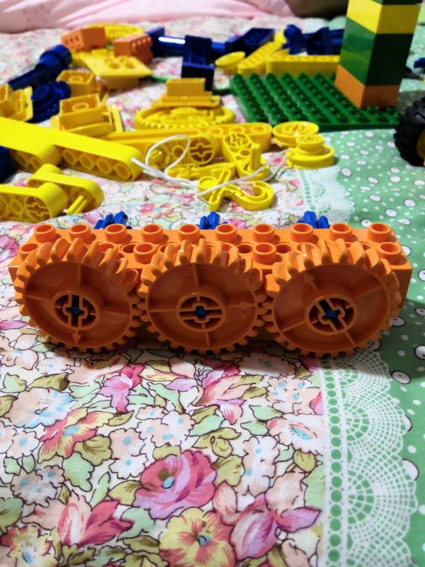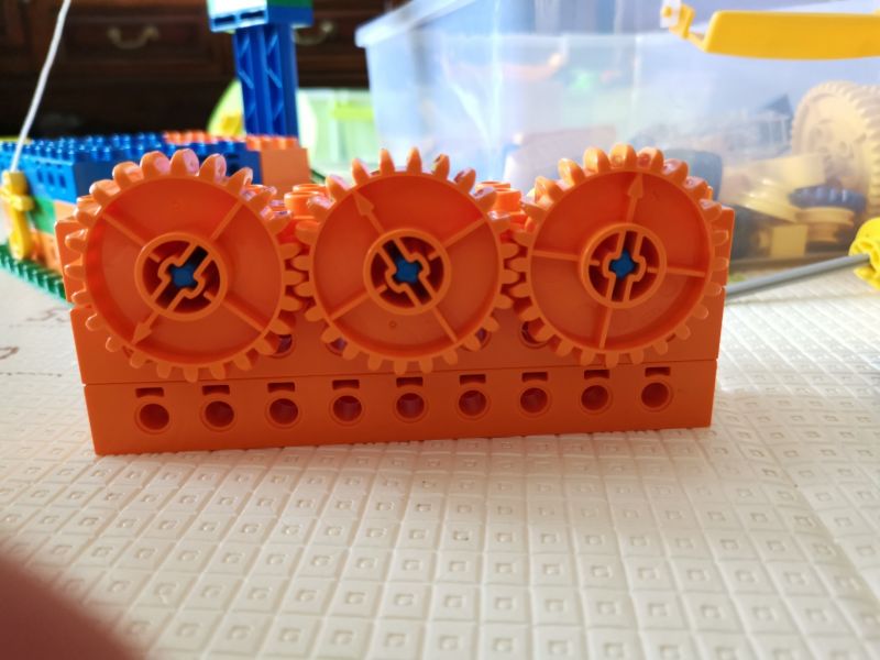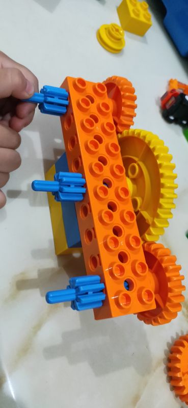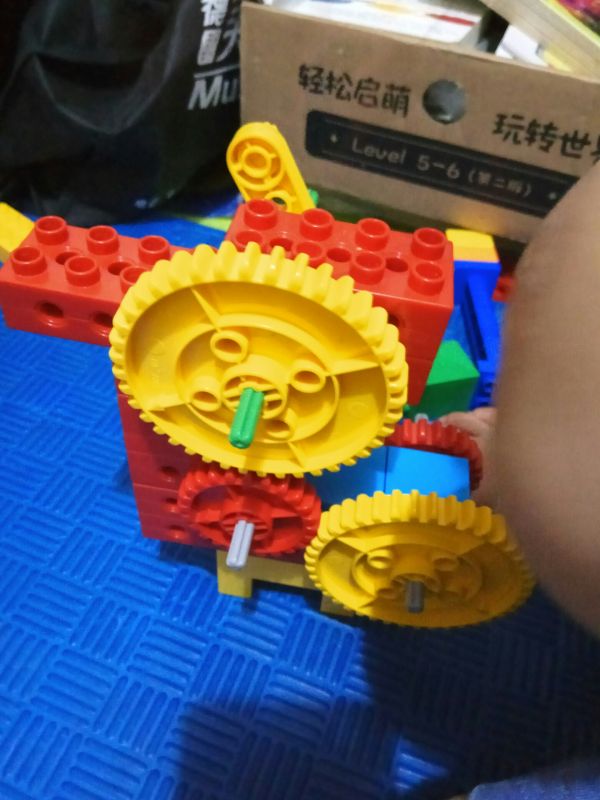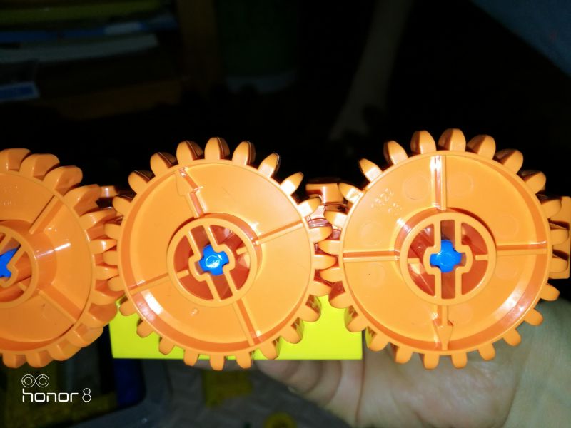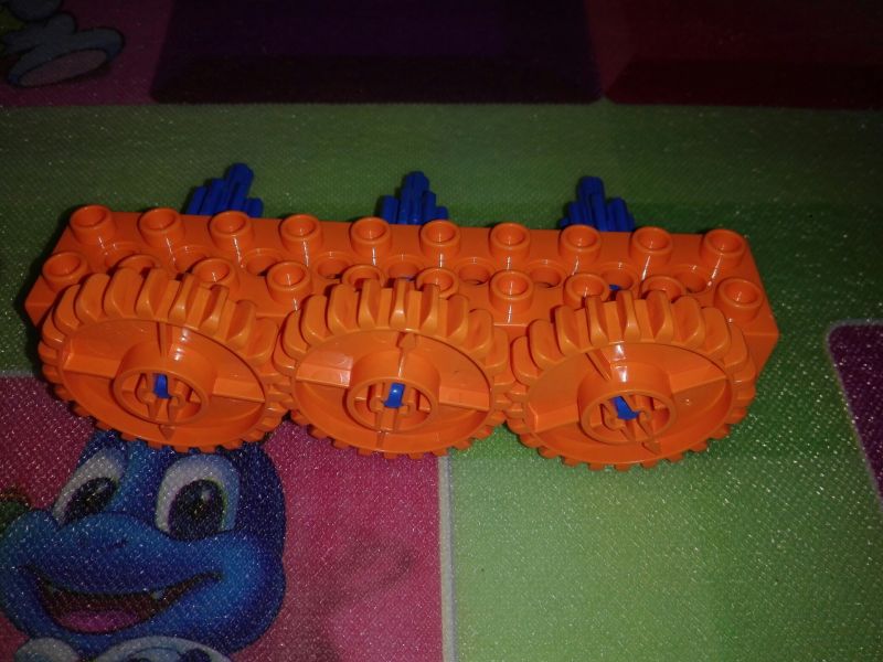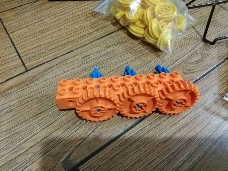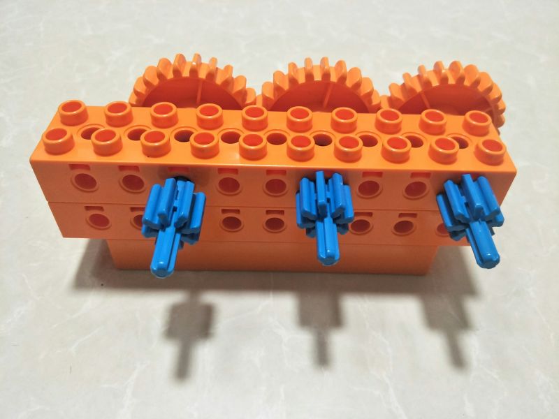 增加传动距离,三个小的装上去发现传动不了,两个大的装上去又太空了,中间小的变成大的,边上两个小的,下面再加一个乐高,就完美了,哈哈