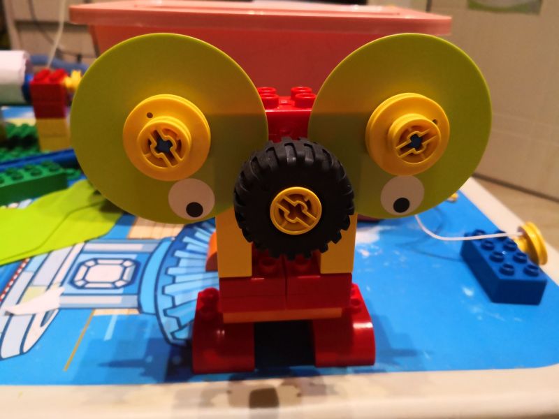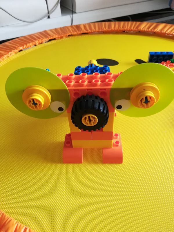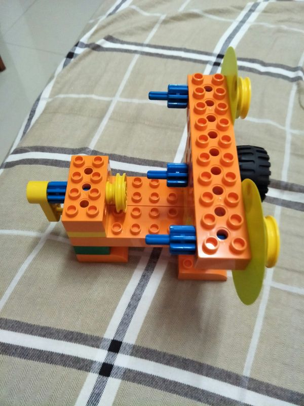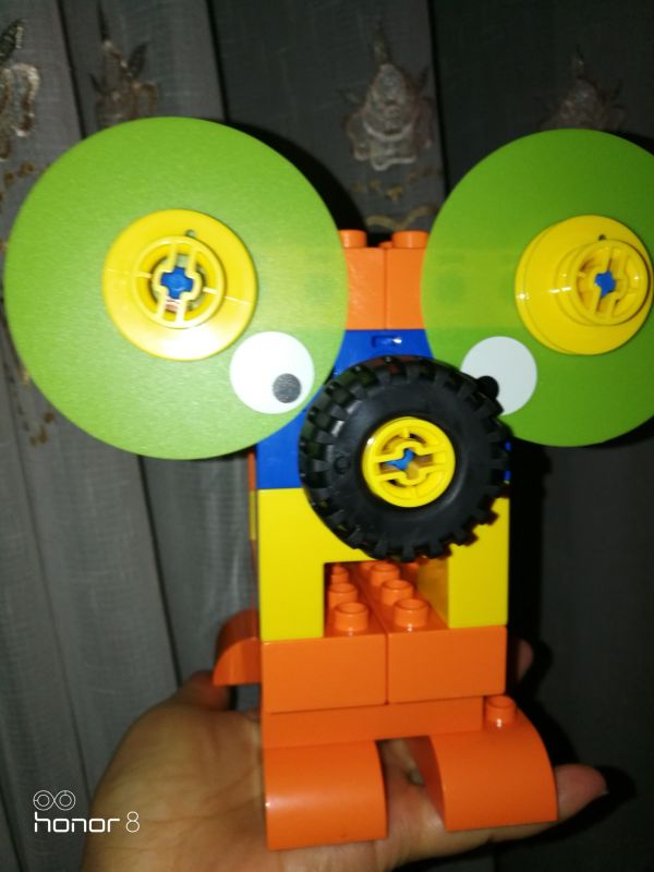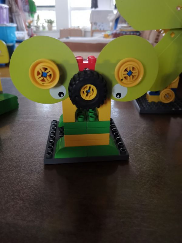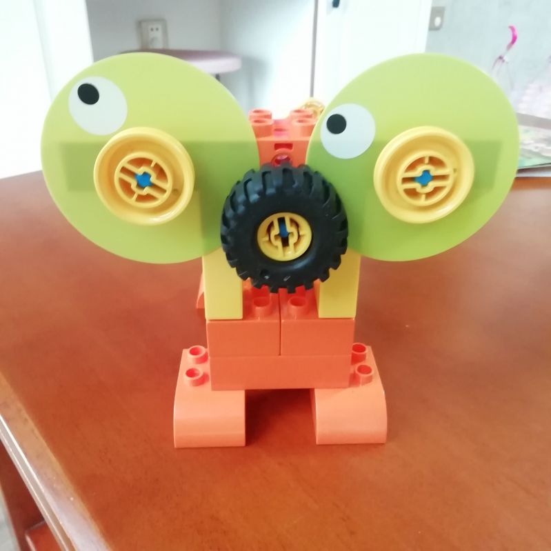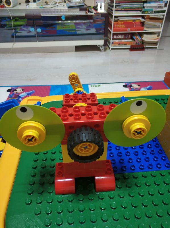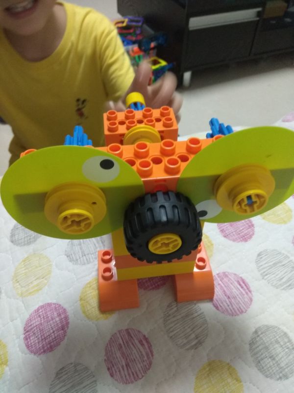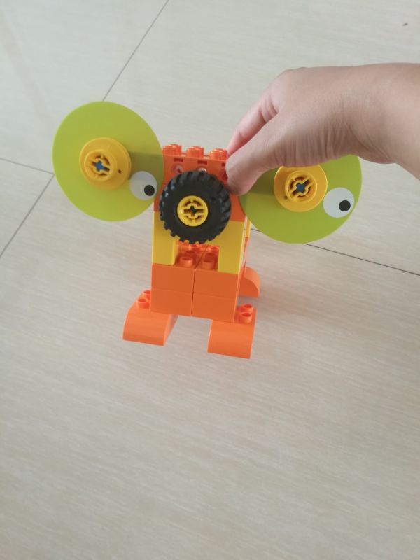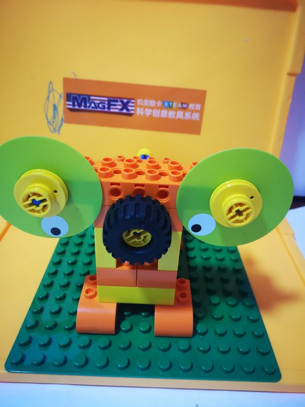 电子狗。使用了镂空结构,互锁结构和汉堡包结构。先把基本构造再来搭建一下就能找到感觉。每次课程可以先让孩子观察所需材料,然后搭建的时候说出来每一步用了什么结构,对打基础真的很有帮助。