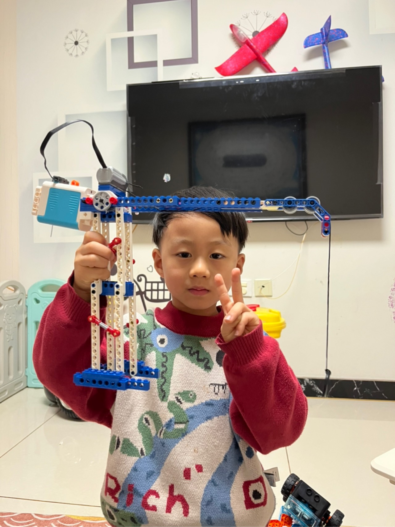 本作品中模拟了塔吊的外形及吊起重物的功能,家长可以告诉小朋友,塔吊前端部分的越野轮毂作为定滑轮使用。