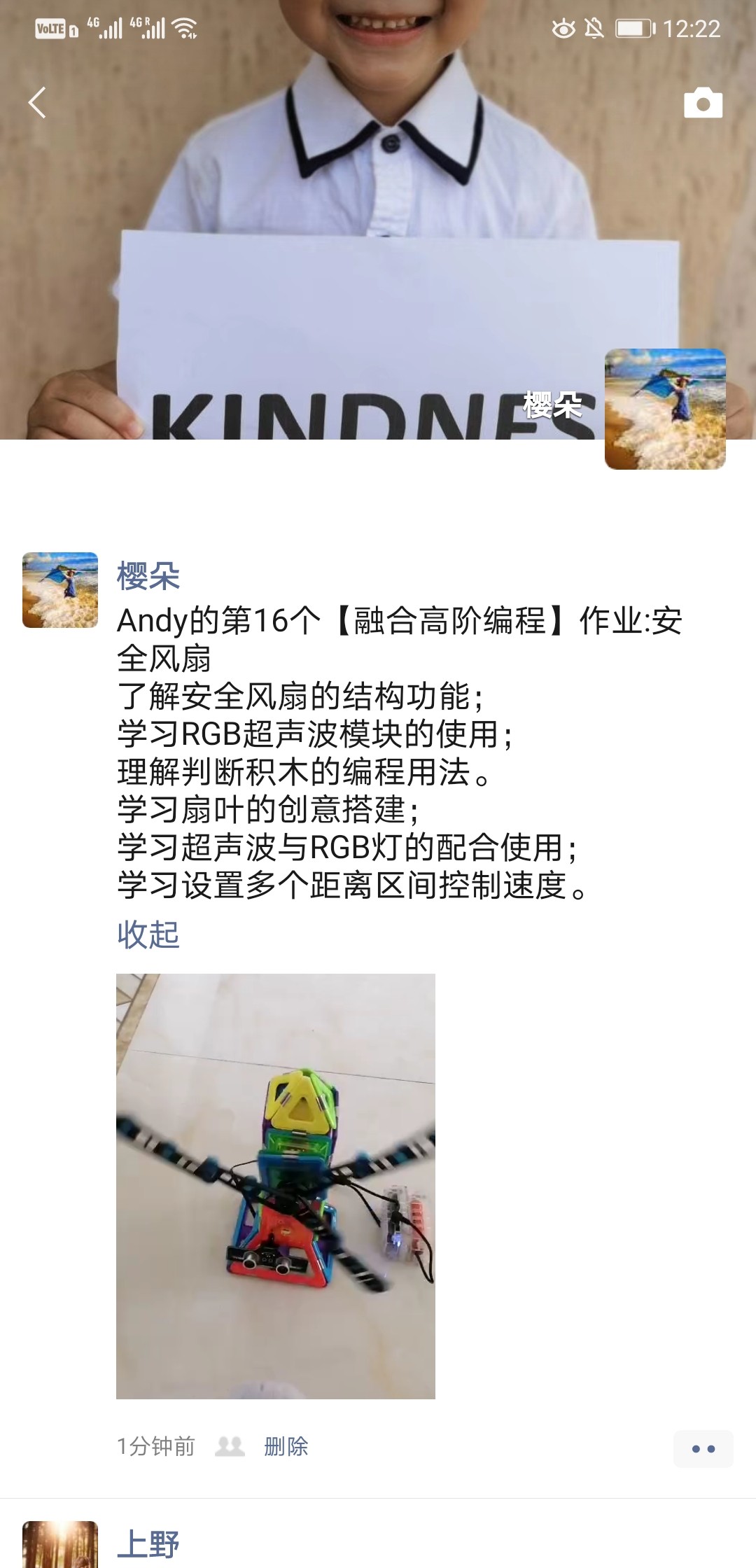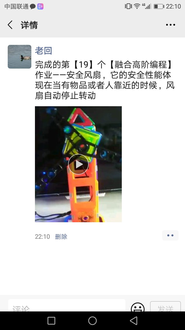完成的第【19】个【融合高阶编程】作业——安全风扇,它的安全性能体现在当有物品或者人靠近的时候,风扇自动停止转动