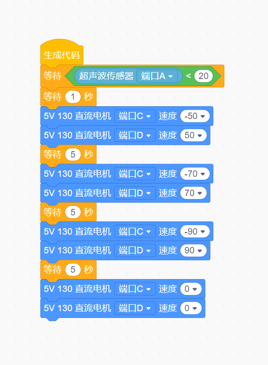 玩法1:打开酷卡侠开关,当超声波传感器检测到前方距离20有人出现后,跑步机以50的速度运行;等待5秒后,跑步机以70的速度运行;等待5秒后,跑步机以90的速度运行;等待5秒后,跑步机停止运行。