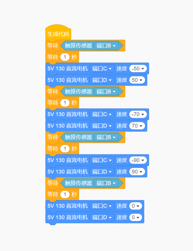 玩法2:打开酷卡侠开关,当按压触摸传感器后,跑步机以50的速度运行;再次按压触摸传感器,跑步机以70的速度运行;再次按压触摸传感器,跑步机以90的速度运行;再次按压触摸传感器,跑步机停止运行。
