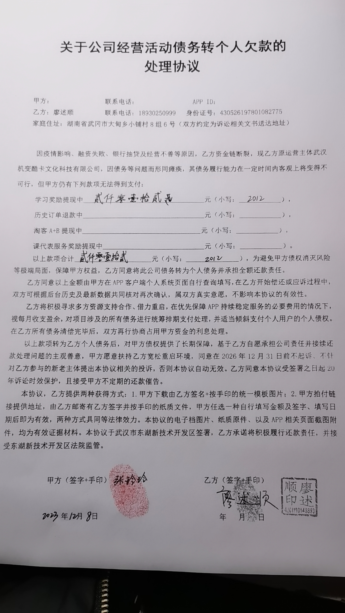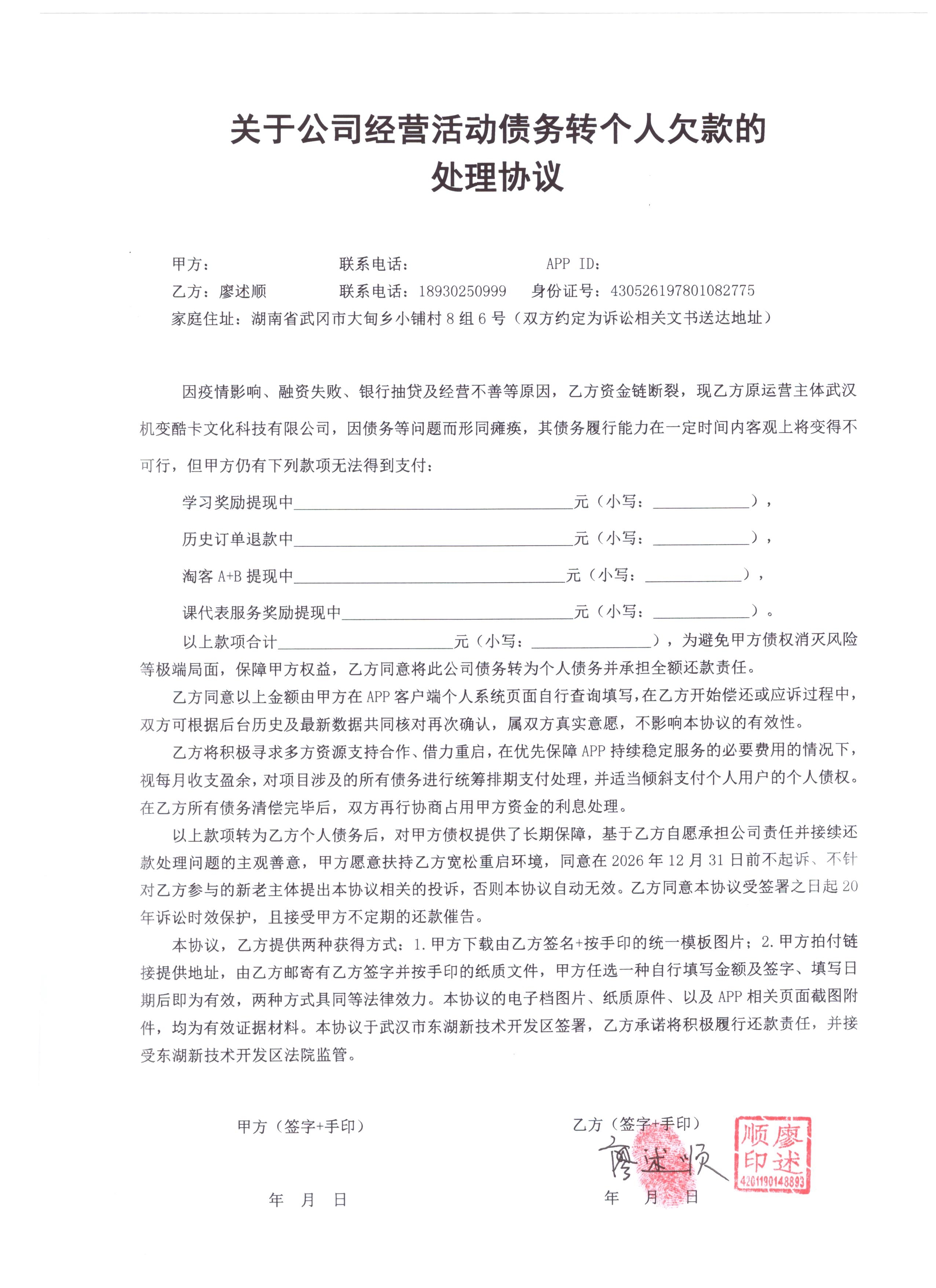 1、下载公司债务转个人债务处理协议并打印(有条件的尽量彩打);